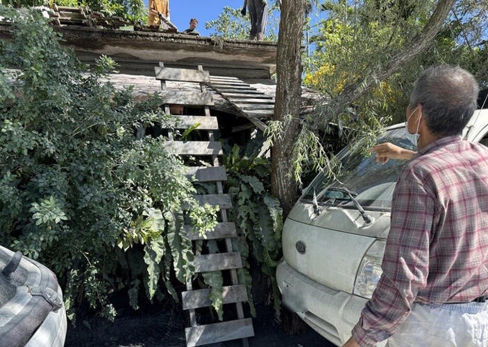 王姓屋主退休後,從台北市移居光復鄉10多年,在光復鄉中正路一段買下平房,一旁種植龍眼樹等樹木,颱風樺加沙前,剛採收完龍眼,木梯就隨手放在家門口。王姓屋主說,22日開著小貨車撤離到豐濱鄉、海拔較高的工寮,洪水隔天回來,看見道路淤泥很深、門前車輛東倒西歪,屋子兩側多了好幾個木梯子,正疑惑著「印象中沒有把梯子放下來啊」。