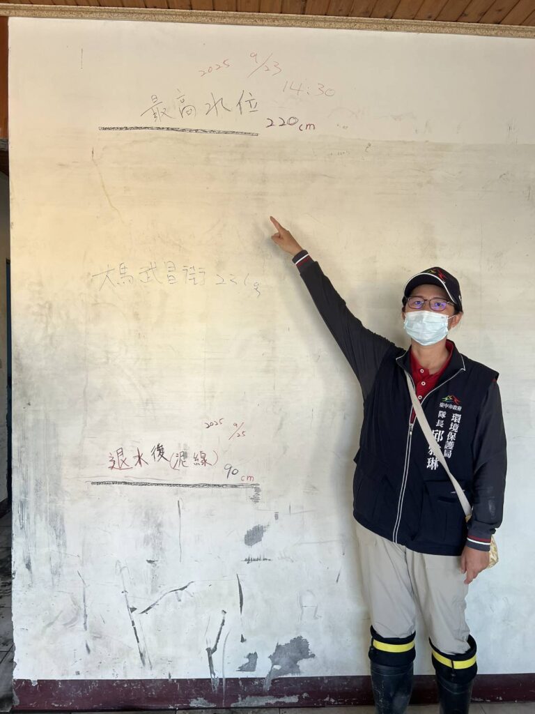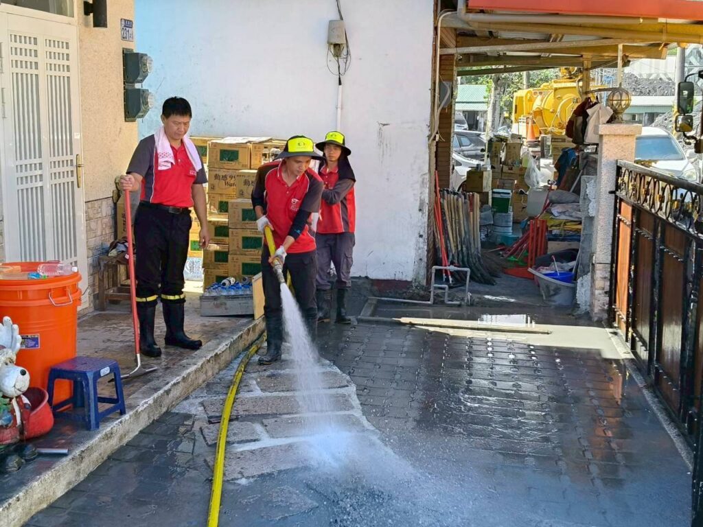 環保局大隊長邱雅琳表示,日前清理民宅獲得居民好評,吸引鄰近居民前來預約支援。團隊兩日已完成九戶民宅及一間農機行清理。面對牆面高達一層樓的淹水痕跡及厚重污泥,環保局調派清溝車與灑水車強力沖洗,再由同仁化身「刷子超人」、「刮水超人」合力清潔,總計完成約五千二百平方公尺清理,協助居民家園逐漸恢復整潔。兩天已完成九戶民宅及一間農機行清理,還不斷有居民主動來預約協助幫房子「洗澡」。