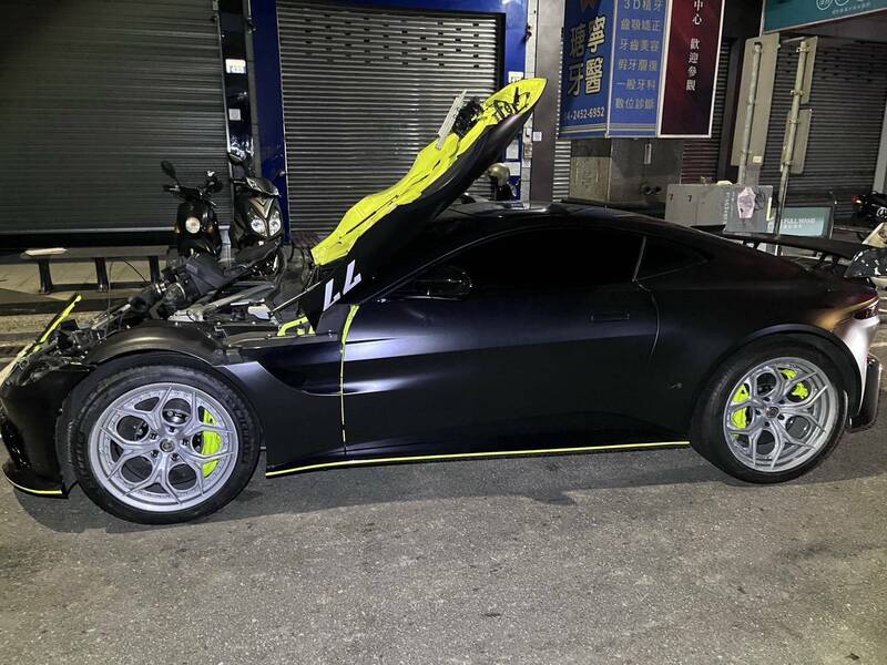 一千四百萬詹姆士龐德御用車,疑轉彎失控連撞三車車頭撞爛,駕駛落跑。(記者孫義方攝)