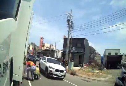 清潔隊員在車陣中撿拾民眾掉落之千元大鈔。(記者孫義方攝)