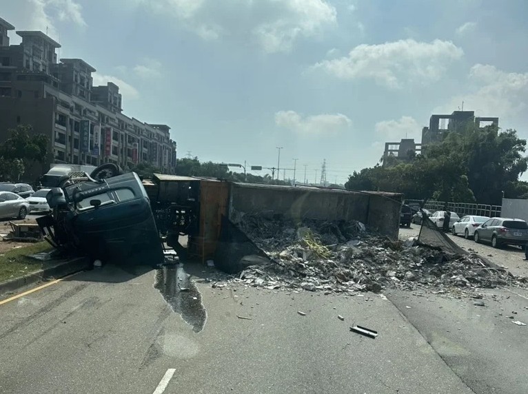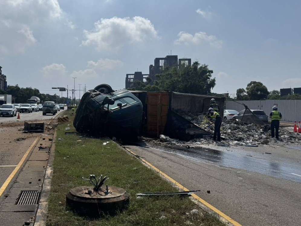 煞車失靈侯姓駕駛當機立斷撞安全島,大貨車翻車阻斷往市區車道。(記者孫義方攝)