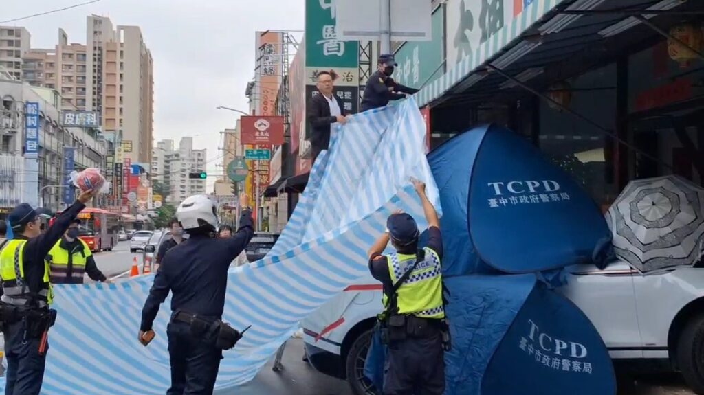 由於何男撞擊後卡在駕駛座內,警方鑑識人員費時採證後,為保全車體外部可能的跡證,就將案發現場拉起帆布遮蓋,報請台中地檢署相驗釐清案情與死因。至於,何男是否抹頸自殺,警方表示,還須釐清調查中。