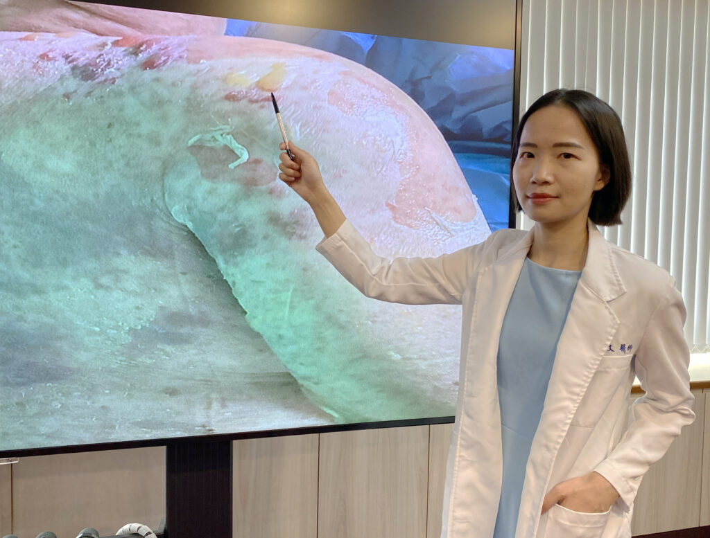 陳韻文醫師解釋,罹患史帝文強生症候群的病人全身會出現紅疹與水泡,皮膚如同水蜜桃般脆弱。(記者孫義方攝)