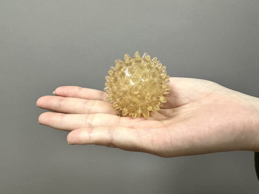 運動醫學中心施宇宸物理治療師表示,這顆再生按摩球雖外觀樸實,卻是病患的好幫手,可藉由按摩球進行滾壓與按壓等動作,有助放鬆肌肉、促進血液循環,尤其對肌筋膜較緊繃的人更有幫助。