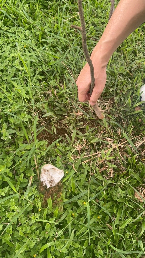 警方在公園起獲黃男埋在公園土裡的十一小包毒郵票。(記者孫義方攝)