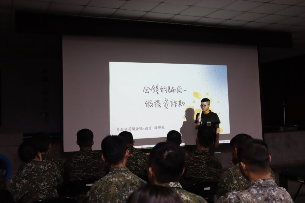 國軍官兵專場則由許巡官主講,以「投資不是打靶,不是瞄準就中」開場,引得現場笑聲不斷。許巡官指出,假投資詐騙已成為軍人受害比例上升的主要原因之一,詐團最常以「投資老師」、「股市內線」、「群組喊單」,甚至假冒軍中學長、袍澤名義推薦,讓弟兄們誤以為消息可靠,其實全是詐團自導自演。「如果投資真有這麼神準,我們早就辭職不幹了。」他提醒弟兄,只要對方要求匯款到私人帳戶、強調限時入金、拒絕視訊驗證或催促加碼,就應該立即撥打165求證。