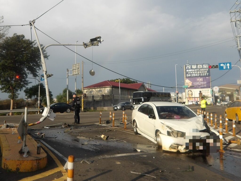 黃男駕駛轎車自撞路口號誌桿,導致號誌桿斷裂。(記者孫義方攝)