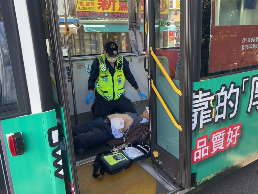據調查,台中市消防局二日上午十時四十九分獲報,東勢區豐勢路有人需救護,報案人公車謝姓駕駛(四十二歲)表示,車上一名男性乘客摔倒,還有呻吟聲,勤務中心立即派遣東勢分隊救護車二人前往救護老翁,抵達後發現潘翁已經沒有呼吸、心跳,經給予必要處置後送往東勢農民醫院救治。