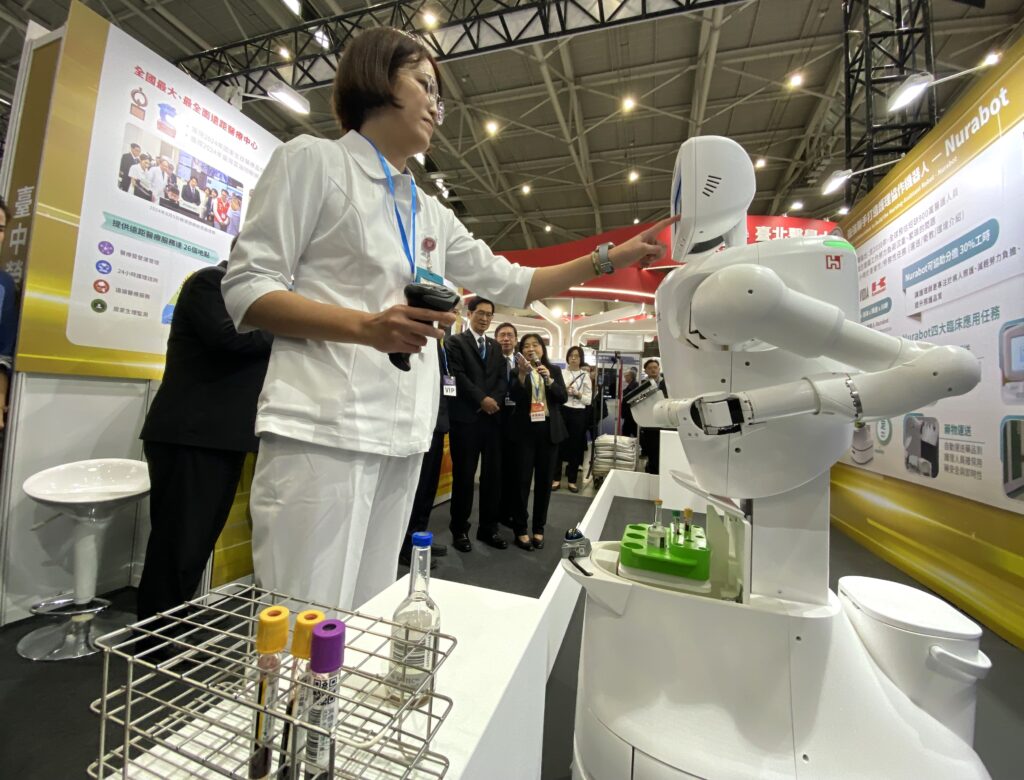 臺中榮總於「台灣醫療科技展」展示護理協作機器人Nurabot。(記者孫義方攝)