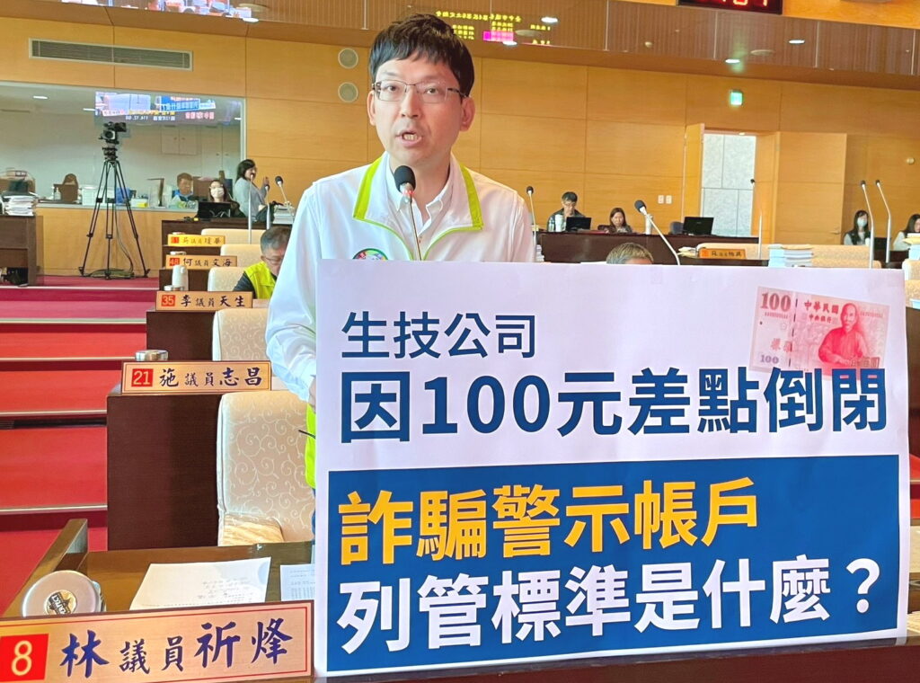 〔記者呂雪蘋、孫義方台中報導〕台中市議員林祈烽八日揭發一起警示帳戶列管案件,直指有民眾手持五十三張各匯入一百元的匯款單,前往派出所報案說被詐騙,警方就火速將這五十三個帳戶凍結,包含一家正常營運的生技公司也遭波及,該公司因帳戶遭凍結,險些倒閉!他說,全力支持警方打詐,但應與金融機構做好橫向聯繫,並多方確認後再凍結,不要讓無辜企業蒙受不白之冤。