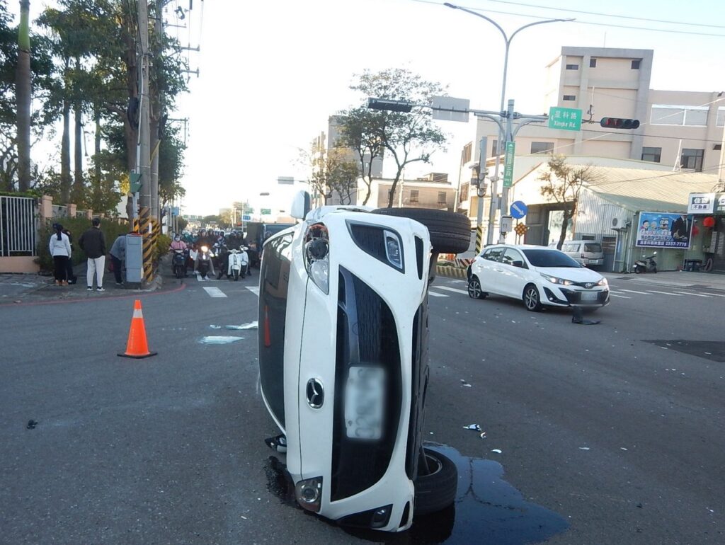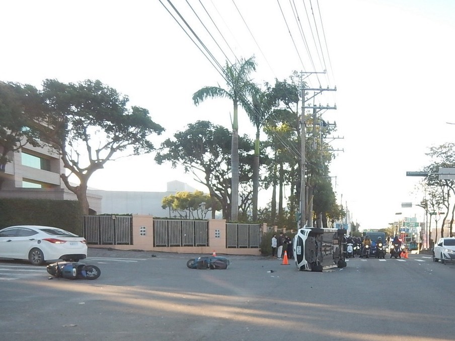 翁男的車則因撞擊後失控向右翻覆,波及行駛於三豐路慢車道的謝姓男子(五十一歲)及李姓女子(七十四歲)等兩名機車騎士;事故中造成謝男左腳擦挫傷但未送醫,李女則四肢多處擦挫傷,已送往豐原醫院接受治療。其餘三名汽車駕駛沒受傷;大甲員警獲報後依規定到場處理,經現場酒測,五名駕駛均未檢測出酒駕情形。