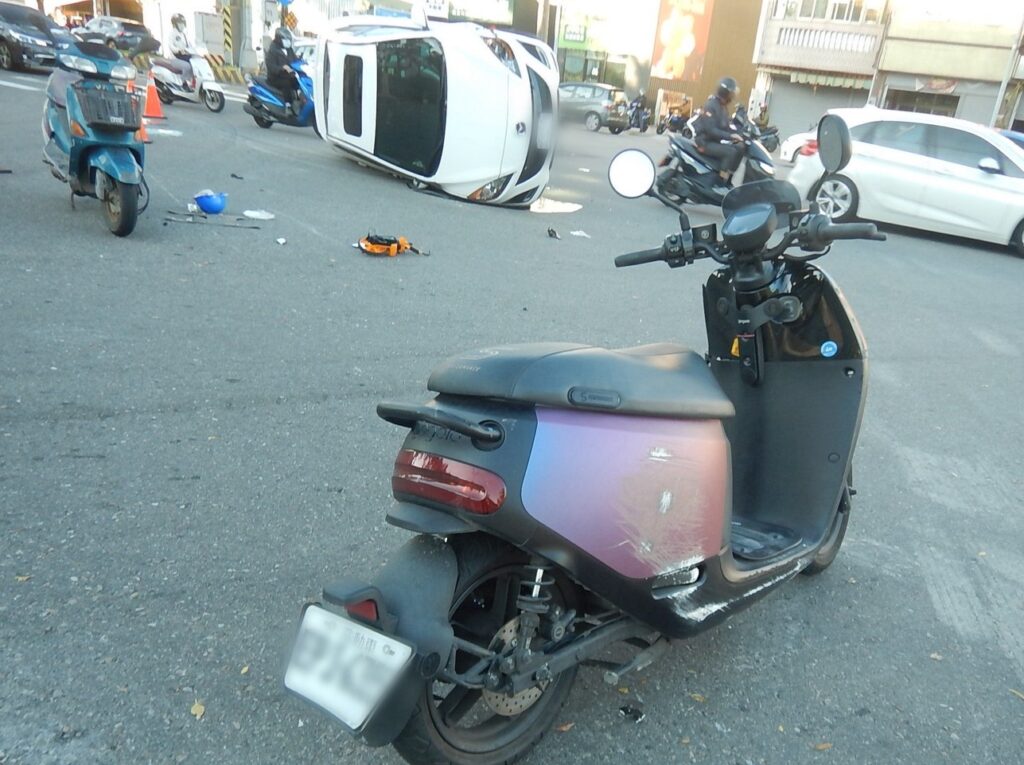 翁男的車則因撞擊後失控向右翻覆,波及兩機車騎士。(記者孫義方攝)