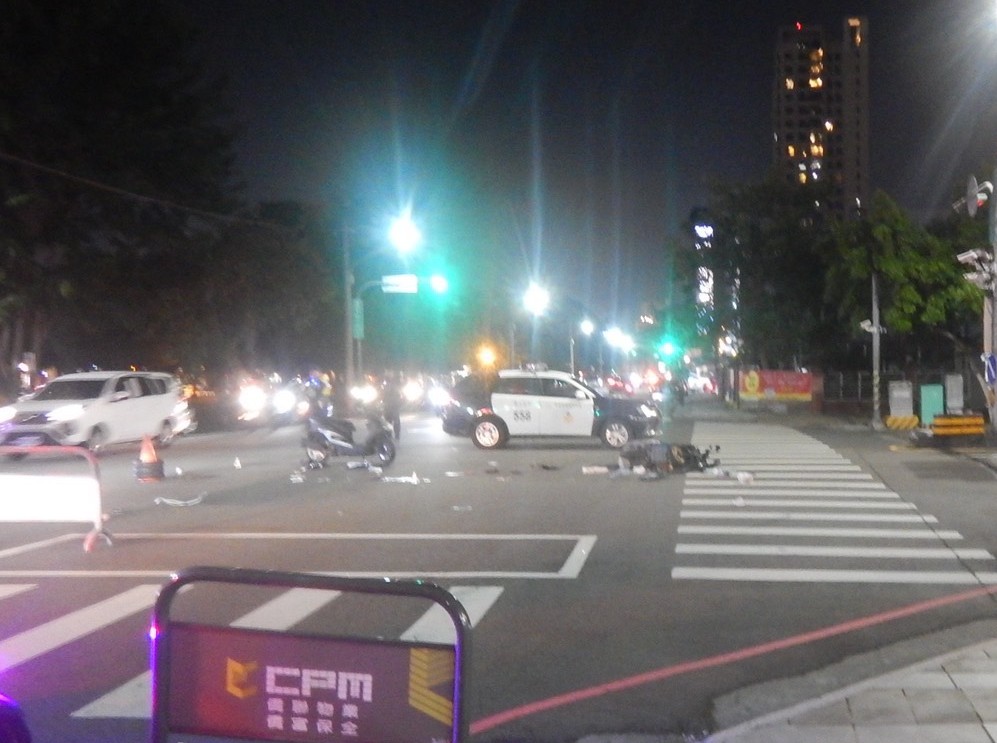 〔記者孫義方台中報導〕台中市北屯區山西路與昌平路口十日晚間下班尖峰時段,發生一起轎車碰撞機車造成一死一傷不幸車禍,事故現場路面散落大量機車殘骸、衣物、護具與個人物品,甚至連鞋子也噴飛數公尺外,警方封鎖現場蒐證,兩輛機車散倒成一片,顯示撞擊力道極為猛烈,彷彿瞬間炸開四散,怵目驚心。