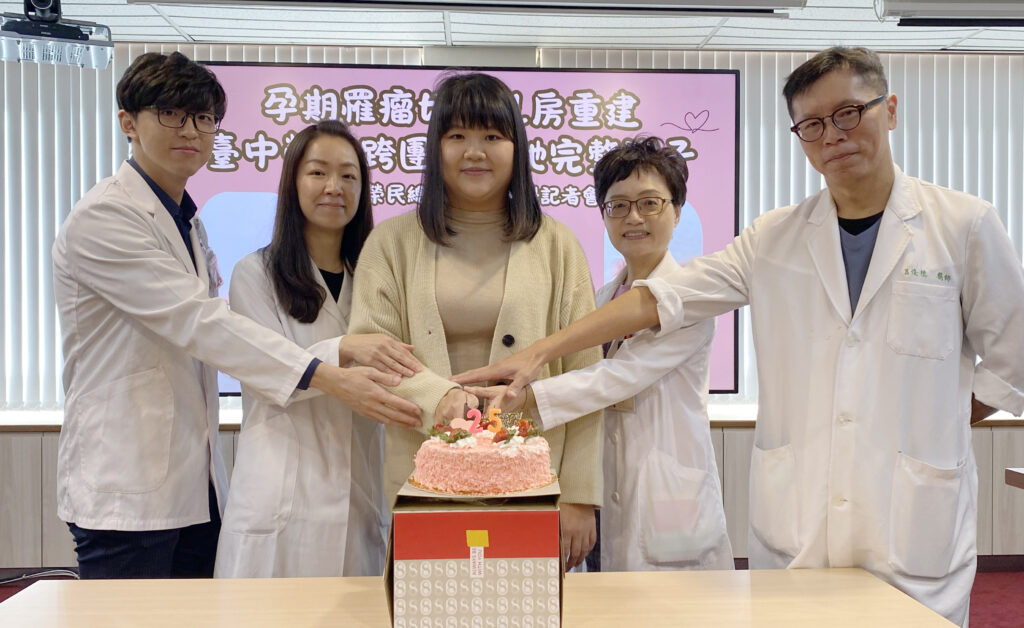 臺中榮總醫療團隊共同照護陳小姐於孕期切除乳房葉狀瘤、重建並順利產子,十二月十一日提前為她慶生。(記者孫義方攝)
