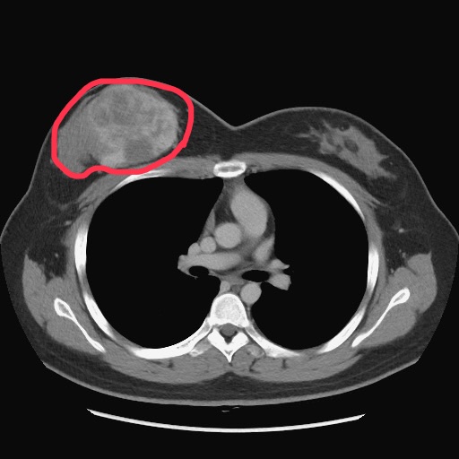 電腦斷層影像可見陳小姐右乳房的葉狀瘤(紅圈處)。(記者孫義方攝)