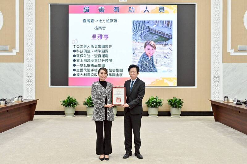 台中地檢署檢察官温雅惠(左)獲行政院頒發第十三波安居緝毒專案有功人員獎表揚。(記者孫義方攝)