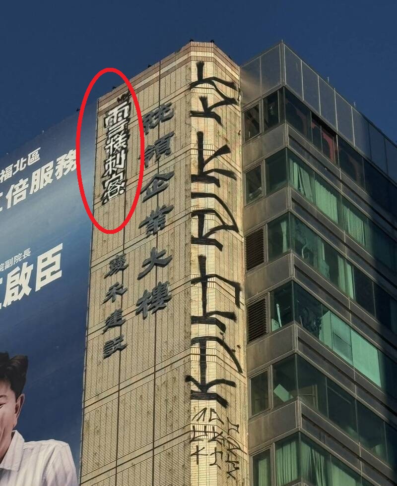 台中大樓外牆出現高空塗鴉,署名「雪糕刺客」(紅圈處)警方鎖定謝姓男子。(記者孫義方攝)