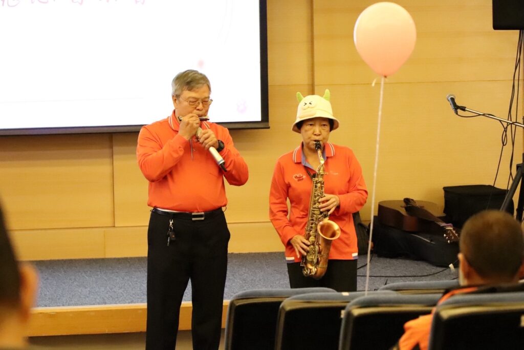 接受大愛肝臟移植的吳女偕同丈夫現場吹奏一段薩克斯風樂曲。(記者孫義方攝)