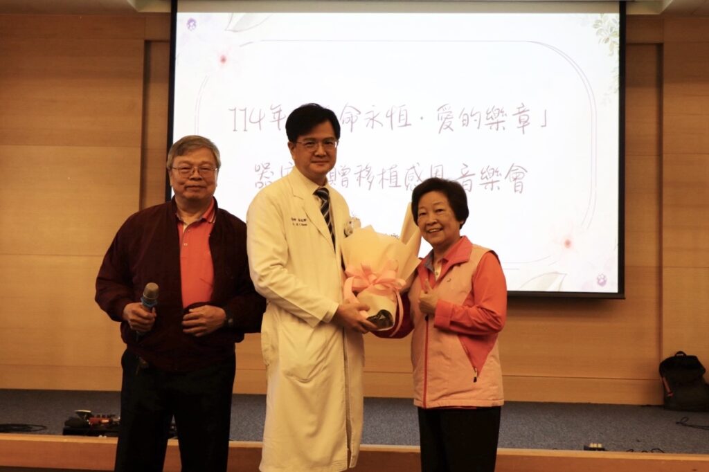 接受肝臟移植的吳女也到場,與丈夫現場吹奏薩克斯風樂曲來表達出重生心情,吳女因肝癌及相關併發症,治療期間病情反覆,身心飽受折騰,在決定接受肝臟移植後,有幸地在等待數個月迎來受贈的好消息,獲得新生不僅喜悅更是充滿了感激,感謝大愛者與其家人無私的捐贈;吳女也特別準備花束贈予主治醫師薛冠群醫師,感恩醫療團隊的悉心照護。