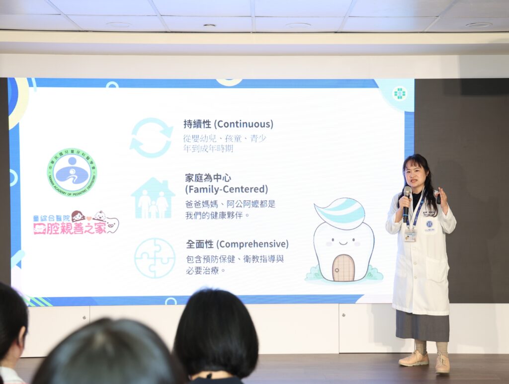 兒童牙科陳瑋玲主任表示,根據中華民國兒童牙科醫學會建議,孩子在一歲以前,就應該進行人生中第一次的牙科檢查,建立家庭與兒童牙醫之間緊密的關係,並且教育家長如何幫孩子口腔清潔與飲食搭配。口腔親善之家能夠為零歲孩子開始提供長期口腔健康照護,一直到孩子成長到十八歲為止,讓孩子健康的邁向人生下一個階段。