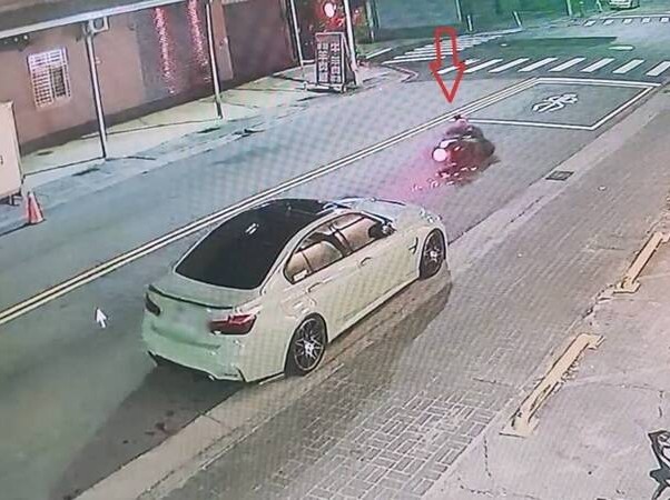 警方隨即陪同調閱周邊監視器鎖定關鍵畫面,影像顯示,凌晨兩點半左右,一輛機車行經該路段時逐漸偏離直行路線,直接擦撞停放路旁BMW,騎士當場摔車滑行,機車與地面摩擦激起火星,巨大聲響引來附近住戶關切,但騎士沒多久便起身將機車扶起,檢視大致無礙後便在眾人圍觀下離開現場。