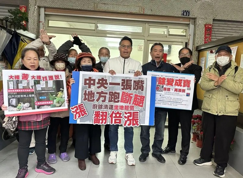 台中市議員楊大鋐(右四)反映,近十個社區陳情,廚餘處理費暴漲,三月起面臨無人收運,引爆民怨。(記者孫義方攝)