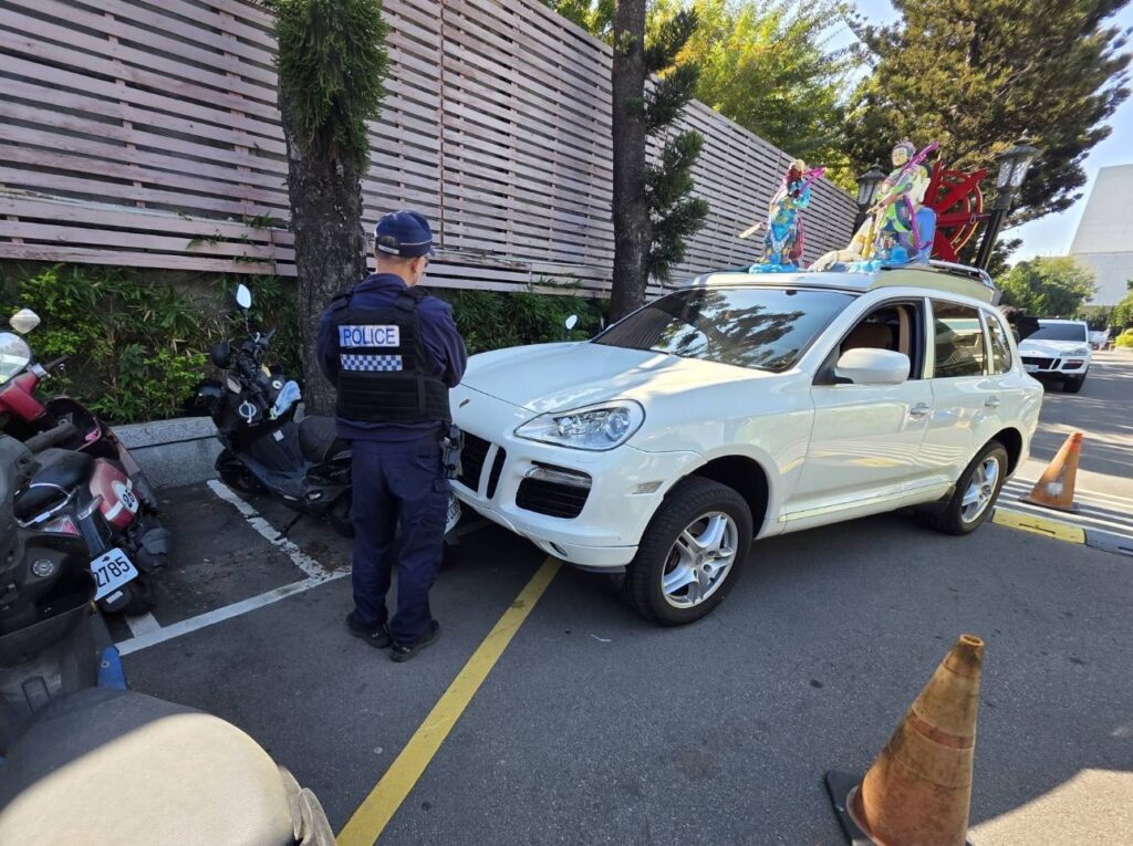 佛祖車未熄火殯儀館內釀傷,警迅速到場依規定查處。(記者孫義方攝)
