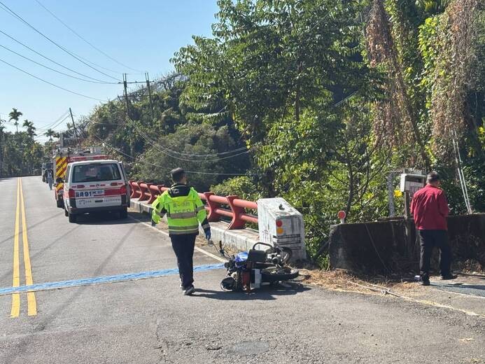 七十三歲楊男騎機車疑自撞後墜橋,送醫不治。(記者孫義方攝)