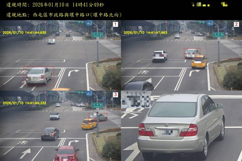 中市警局交通大隊統計,一一四年全年各路口科技執法取締案件數比較,第一名是西屯區市政路與環中路口,共取締四萬九千五百五十九件;第二名是北區中清路與五權路口,全年開出二萬九千二百二十八件;第三名則是北區太原路與崇德路口,則開出二萬六千九百九十七件。