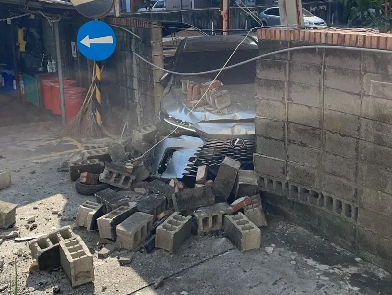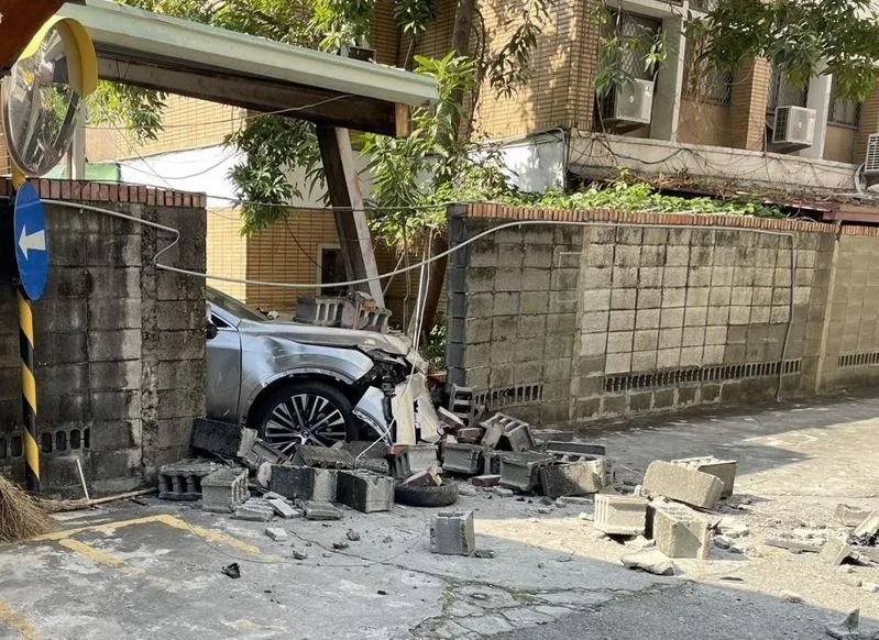 圍牆遭撞倒石塊噴飛,砸到一名台中市府都發局的員工。(記者孫義方攝)