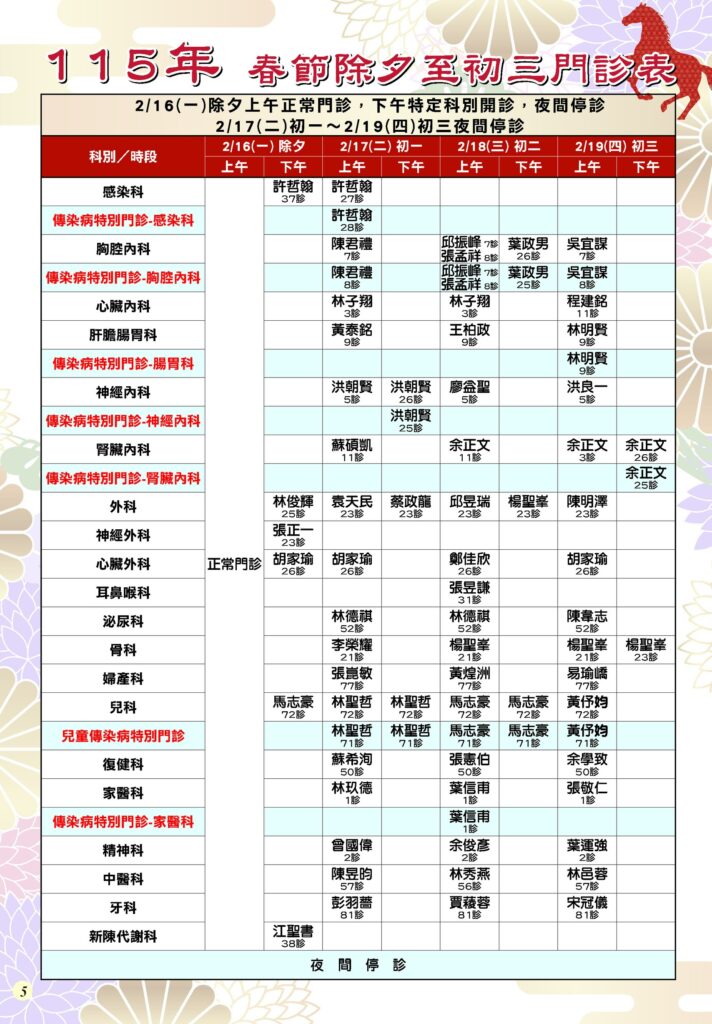 〔記者孫義方台中報導〕衛生福利部豐原醫院二十六日表示,因應農曆春節期間民眾返鄉與聚會頻繁,傳染病防治需求隨之增加,為維持醫療量能並降低急診壅塞風險,豐醫配合衛福部政策,於農曆春節初一至初三(二月十七日至十九日)開設「傳染病特別門診」,以強化就醫分流機制。