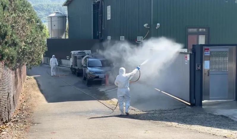 台中市豐原豐康牧場經市府證實,蛋雞染禽流感陽性並派員到場消毒。(記者孫義方攝)