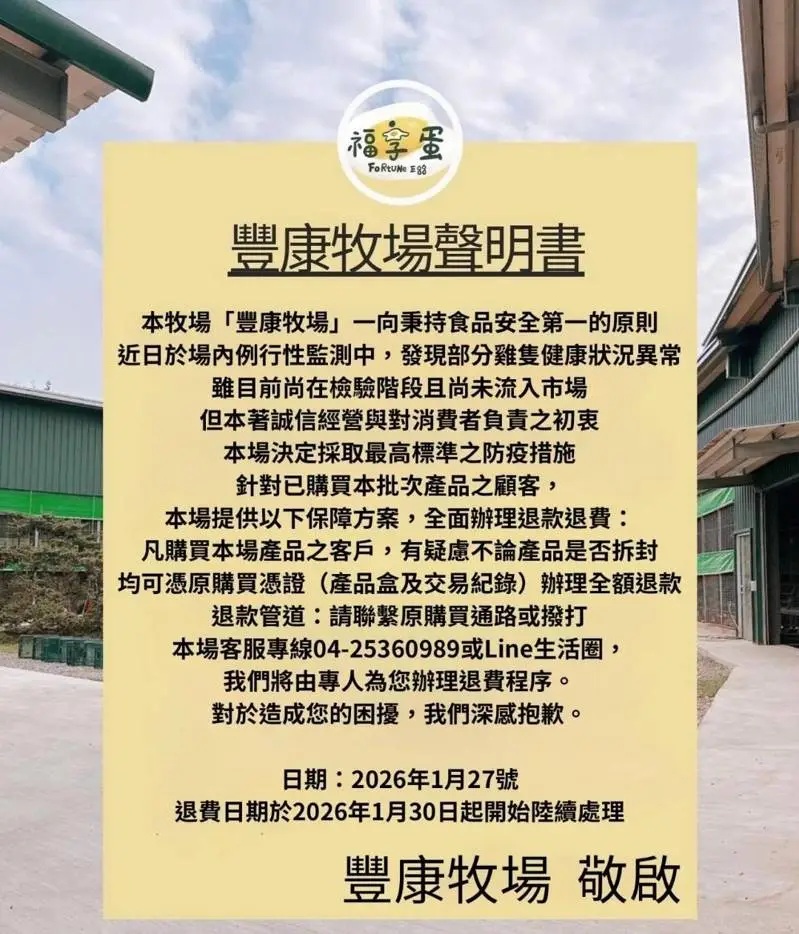 豐康牧場在臉書PO文表示,近日於場內例行性監測中,發現部分雞隻健康狀況異常,雖目前尚在檢驗階段且尚未流入市場,但本著誠信經營與對消費者負責之初衷,本場決定採取最高標準之防疫措施,針對已購買本批次產品之顧客,提供以下保障方案,全面辦理退款退費,凡購買本場產品之客戶,有疑慮不論產品是否拆封,均可憑原購買憑證(產品盒及交易紀錄)辦理全額退款。