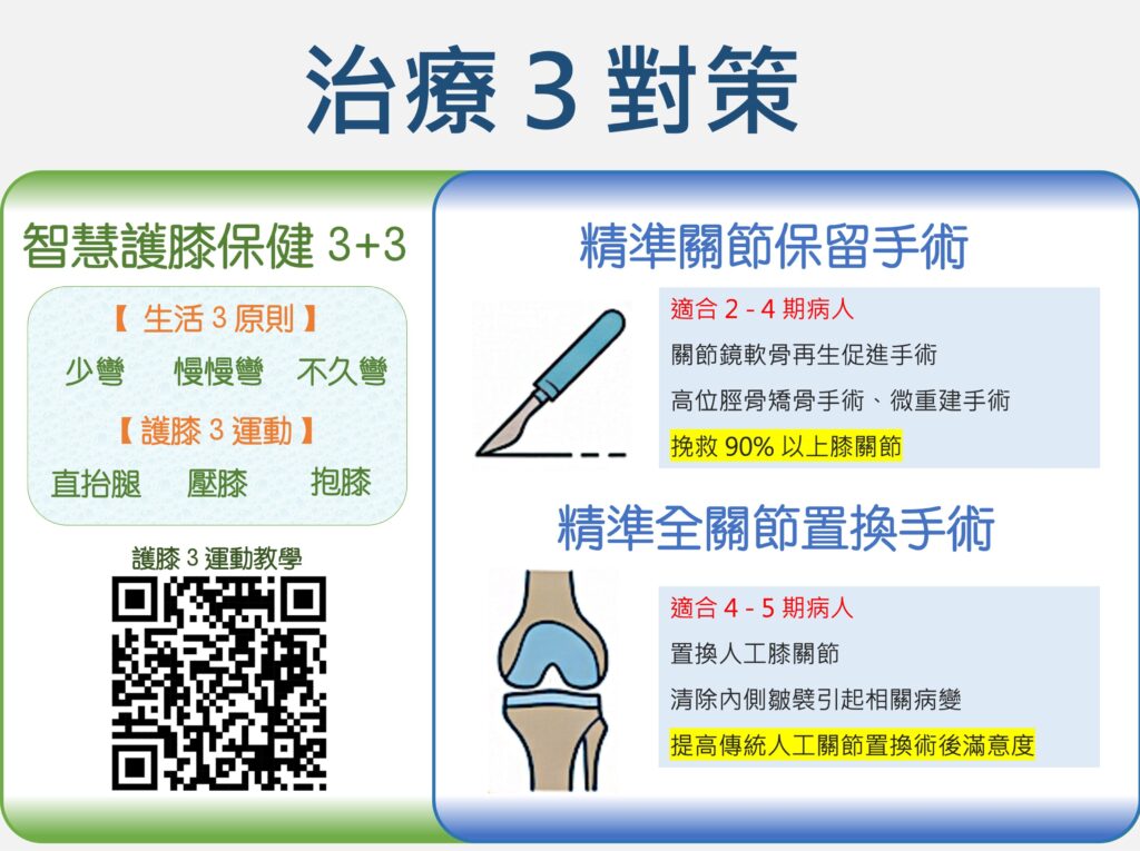 呂紹睿教授指出,膝關節健康促進方案(KHPO)可以用「護膝三三三,健康真簡單」口訣含括。在骨性膝關節炎第一至第二期時,「生活三原則:少彎、慢慢彎、不要彎太久」與「護膝三運動:壓膝、抱膝、直抬腿」雙劍合璧的「智慧護膝三+三」,能為大多數病人逆轉不適症狀;當病程進展到需要醫療介入時,「治療三對策」的「保膝手術:關節鏡軟骨再生促進手術(ACRFP)、高位脛骨矯正手術(HTO)或微重建手術(UKA)」,可以依病程期別,最大程度保留病人健康的關節結構。至於病程末期、關節嚴重變形的病人,則以精準人工關節置換手術(TKA)重建膝關節,搭配精準清除發炎病灶,術後滿意度高達97%。