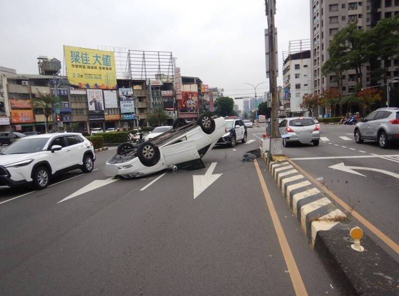 據調查,事故發生在六日下午,六十歲張姓男子當時駕駛轎車,沿進化路中間車道往進化北路方向行駛,行經事發路口時不明原因突然左偏,接著只見轎車自撞中央分隔島,導致車輛當場翻覆四輪朝天,所幸張男僅手部擦挫傷,意識清楚,未送醫治療。