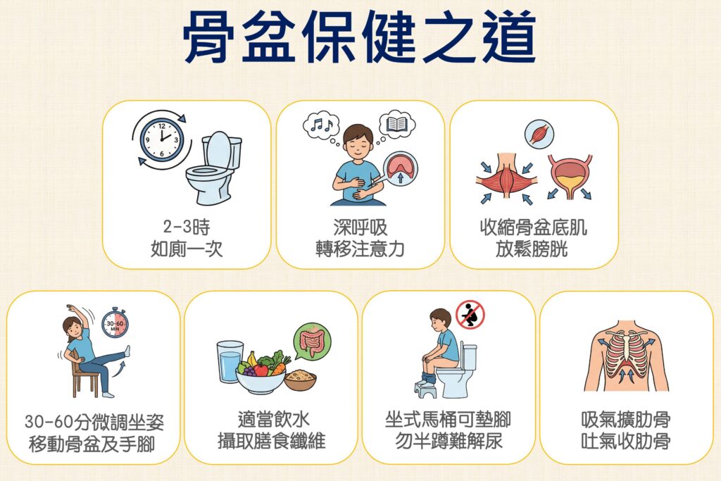 除了排尿困擾,長時間固定坐姿對骨盆的影響更需注意。林智佳解釋,久坐不僅導致腰痠背痛,也會增加骨盆底肌肉與腹內壓力。他建議,乘車時應每三十分鐘至一小時微調姿勢,例如進行骨盆前後輕微擺動、伸展雙腳或轉動腳踝;同時應避免一直刻意縮小腹,以免肌肉無法放鬆。在停等紅燈或休息時,可透過「吸氣時擴張肋骨、吐氣自然回收」的深呼吸,幫助全身放鬆。