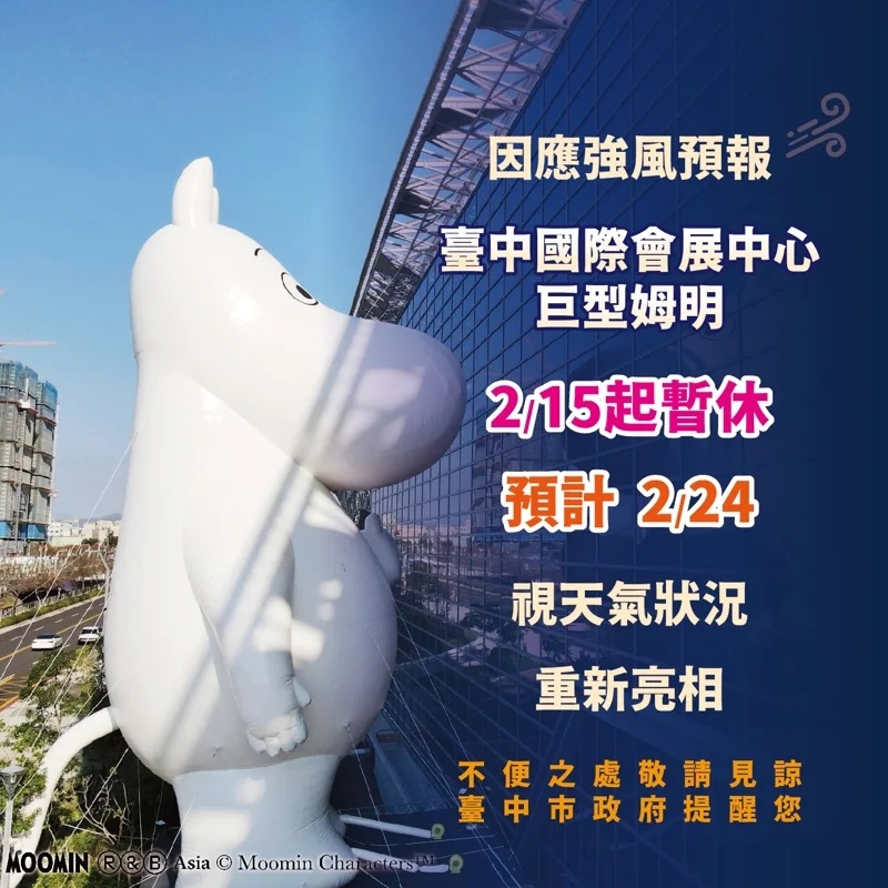 台中市經發局表示,巨型姆明自展出以來,以超萌外型吸引大量市民、遊客前來拍照打卡,成為會展中心熱門地標,但因會展中心外牆為大面積連續帷幕牆設計,當強勁季風吹拂時,容易產生「建築物風場效應」,即俗稱的「大樓風」現象,使建築周邊瞬間陣風強度高於一般空地。依氣象預測,農曆春節期間風力可能達七級以上,為避免氣偶因強風拉扯受損,並確保現場參觀民眾安全,市府決定採取預防性措施。