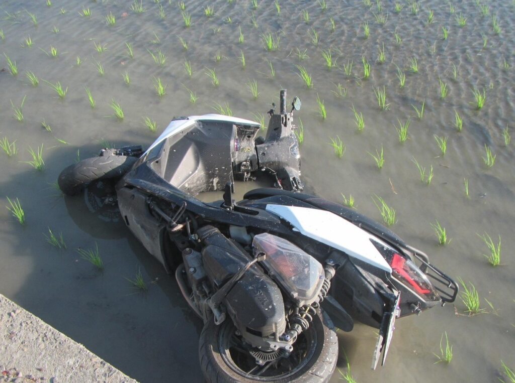 這起事故發生在二十二日下午三時五十一分左右,當時黃姓騎士(二十一歲)騎乘重機沿霧峰丁台路行駛,行經丁台路七五0號前時,與一輛銀色自小客車發生碰撞,黃男當場被撞飛,連人帶車摔進一旁的稻田中。