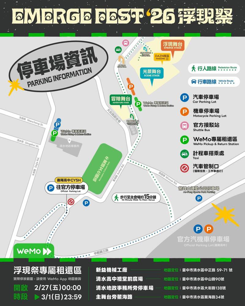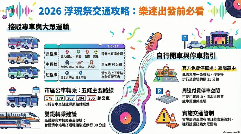 台中市新聞局指出,今年浮現祭集結超過百組海內外音樂人與樂團,演出規模再創新高,活動場域位於清水鰲峰山一帶,周邊道路容量有限,往年活動日吸引數萬人潮湧入,伴隨人流、車流集中,市府已協同相關局處與主辦單位完成整備,將視現場狀況機動調度人力與疏運措施,確保民眾能順利進出會場。