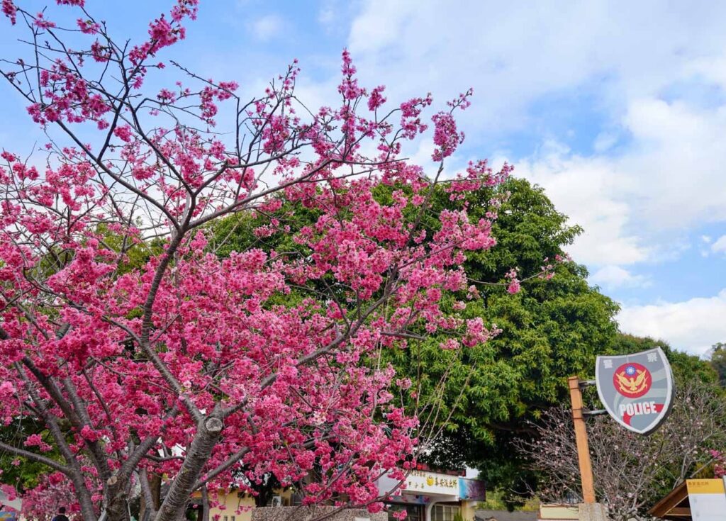泰安派出所櫻花約有八成盛開,二十七日櫻花季登場。(記者孫義方攝)