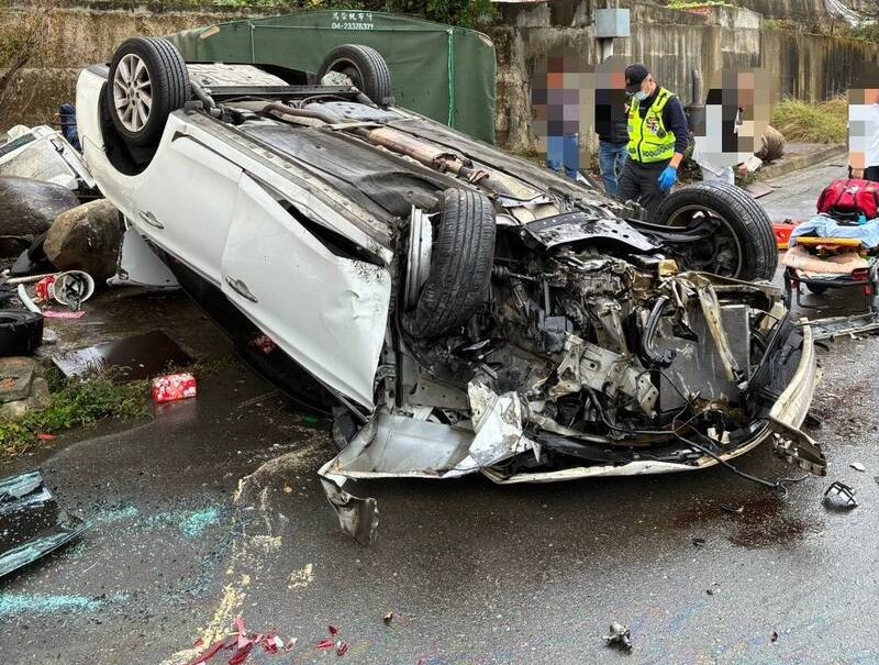 〔記者孫義方台中報導〕台中市北屯區三日傳翻車意外!上午十一時二十五分許,東山路二段一輛白色轎車因不明原因突然失控,自撞路旁民宅圍牆後整輛車四輪朝天翻覆。強烈撞擊力道將車頭撞得幾乎全毀,引擎零件外露、擋風玻璃碎裂,現場碎片散落一地,地面還可見油漬與殘骸,畫面怵目驚心,所幸車內二人送醫無生命危險。
