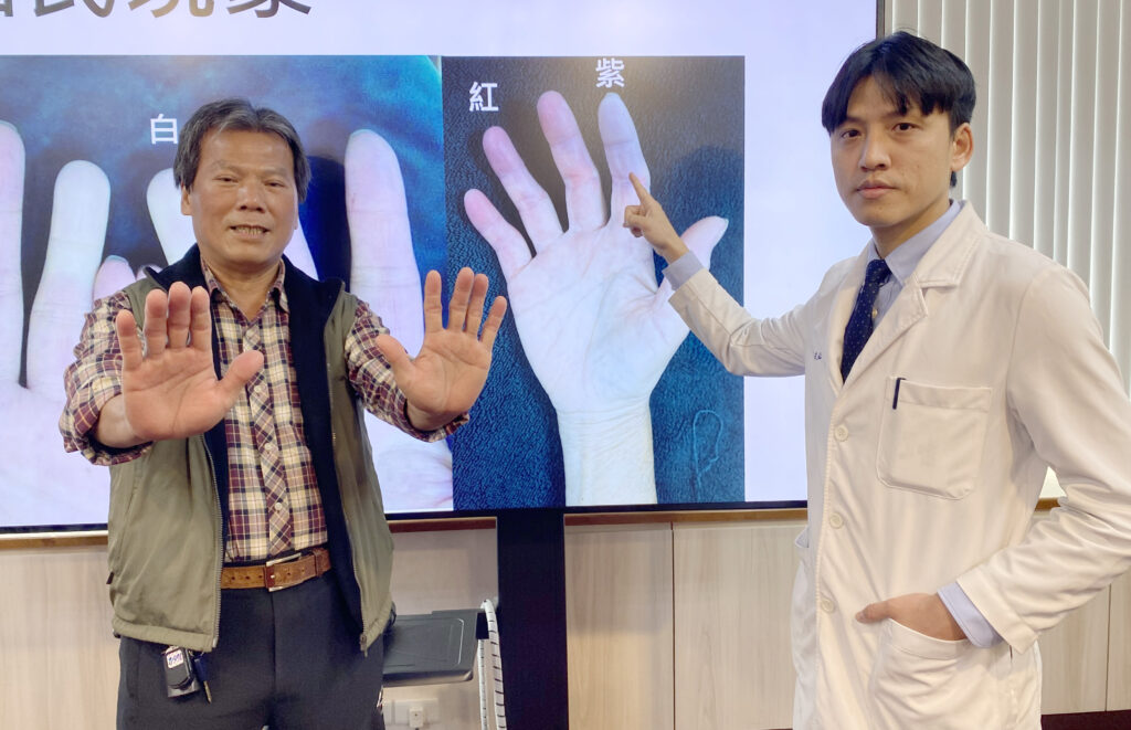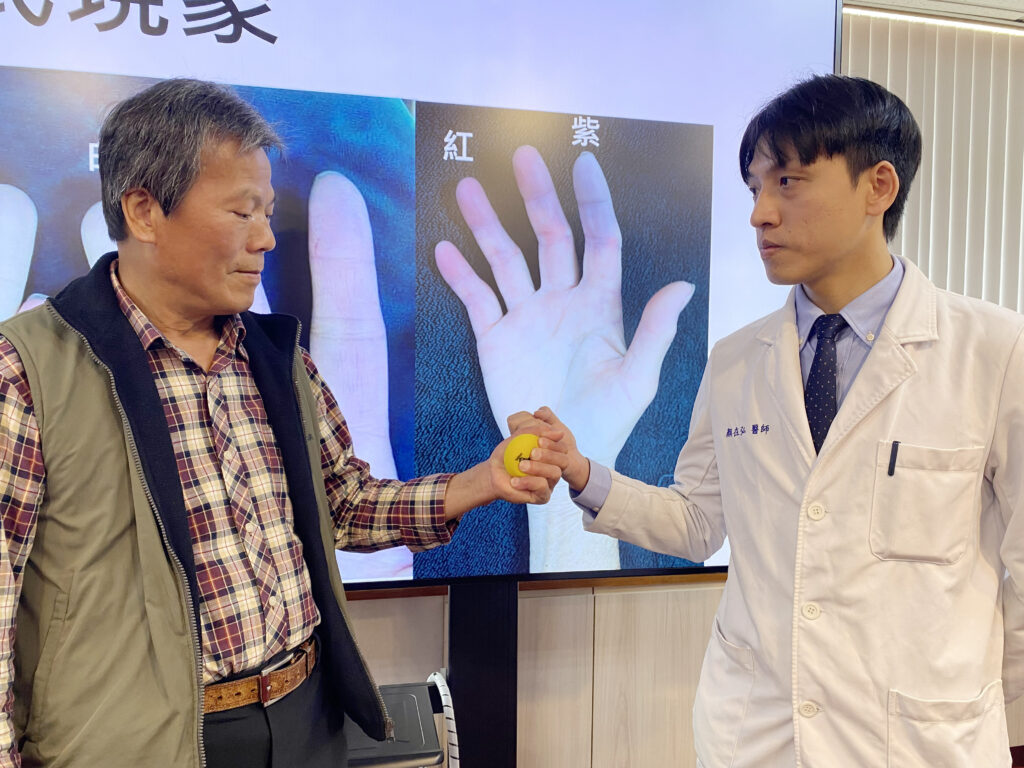 〔記者孫義方台中報導〕台中六十四歲邱姓男子手指尖在寒冷天氣下會變成紫色,輕觸就疼,然後延伸至手臂,連騎機車都疼痛難忍,原以為是末梢神經循環不佳,就醫兩個月看神經科、疼痛科吃藥無改善,病況持續惡化至膝蓋僵硬、無法彎曲,工作被迫中斷。他的護理師女兒帶她到台中榮總過敏免疫風濕科求診,確診全身性硬化症(又稱硬皮症),經顏在弘醫師安排以免疫調節藥物治療後,皮膚緊繃、關節疼痛與皮膚脫色情況明顯改善,重拾生活返回職場。