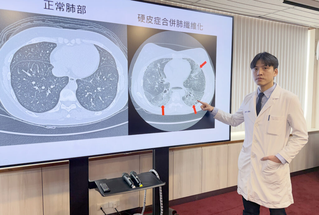 臺中榮總過敏免疫風濕科醫師顏在弘說,肺纖維化是全身性硬化症嚴重的併發症。中榮研究發現,透過抗體檢測可預測高風險族群。(記者孫義方攝)