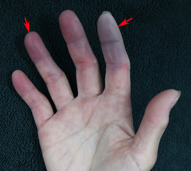 全身硬化症初期症狀是在天冷或接觸冰冷物品時,手指會變紅、變紫(箭頭指處)或變白。(非個案本人照片)。(記者孫義方攝)