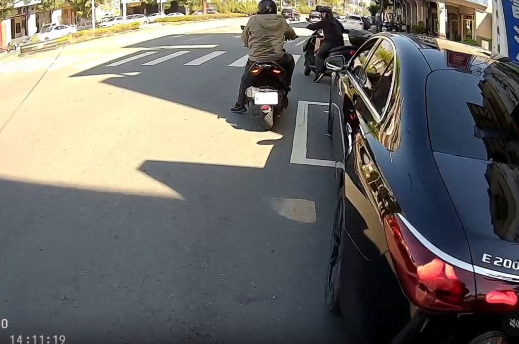 從流傳畫面可見,兩名騎士已依規停在路口等待,其中一人正要切入待轉區,卻發現該區域已被轎車佔據,只能尷尬停在一旁,進退兩難,原本用來保障機車安全的待轉空間,瞬間變成「高級車位」,讓不少人直呼傻眼。