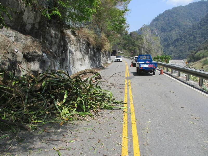 台八線三十點五公里處山壁上的樹木突掉落砸中行經的車輛。(記者孫義方攝)