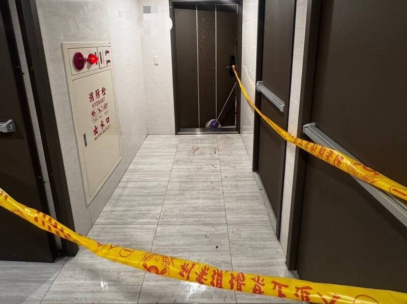 男子住家門口被警方拉起封鎖線,地板還有血跡。(記者孫義方攝)