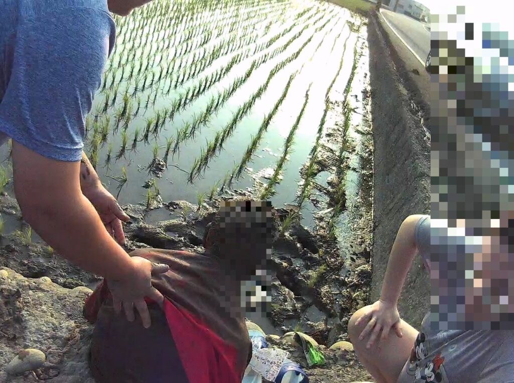 現場泥濘濕滑,老翁臉部浸於泥水中,隨時有窒息危險,警員與民眾見狀立即跳入農田,與在場熱心民眾合力將老翁扶正救出。搶救過程中,員警清楚聽見老翁呼吸聲伴隨肺部水聲,研判可能已有吸入泥水情形,情況危急,警方通報一一九救護人員到場,同時聯繫當地里長協助通知家屬趕抵現場,經初步確認生命徵象後,由救護人員緊急將老翁送到醫院進一步救治,成功救回一命。