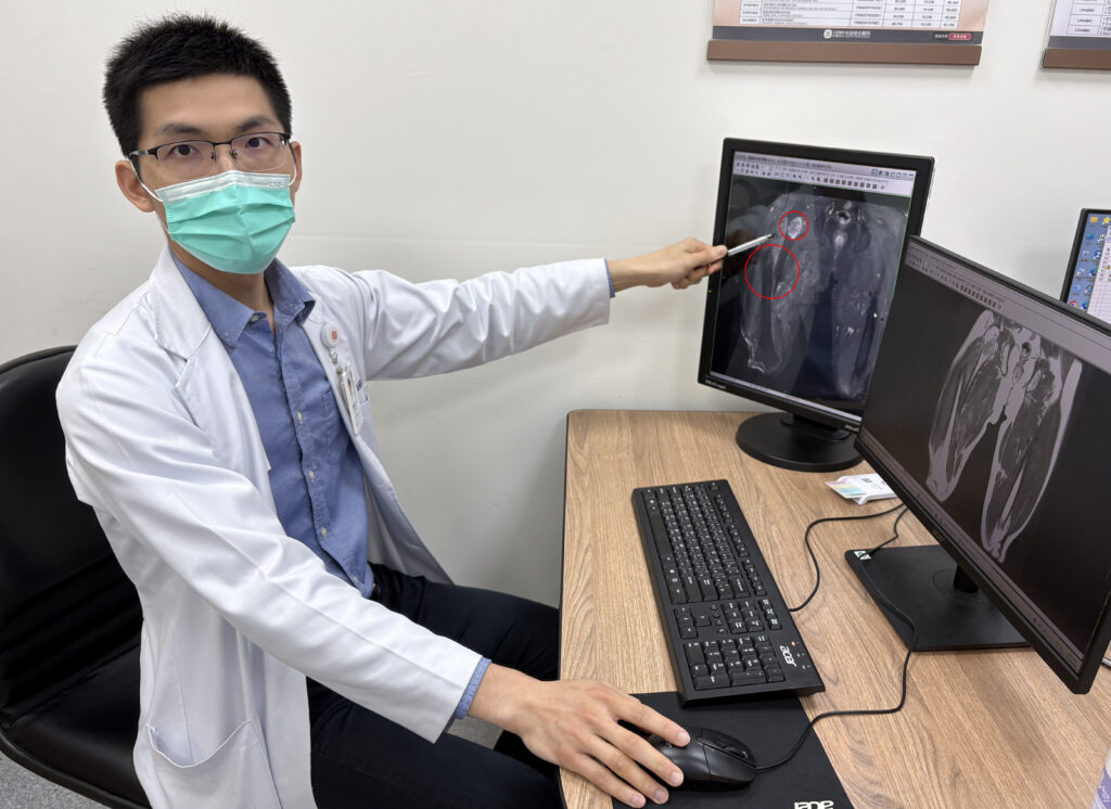 光田綜合醫院骨科部楊鎮源指出,將李先生腫瘤組織徹底刮除,復位大腿骨折,並植入骨髓內鋼釘。(記者孫義方攝)