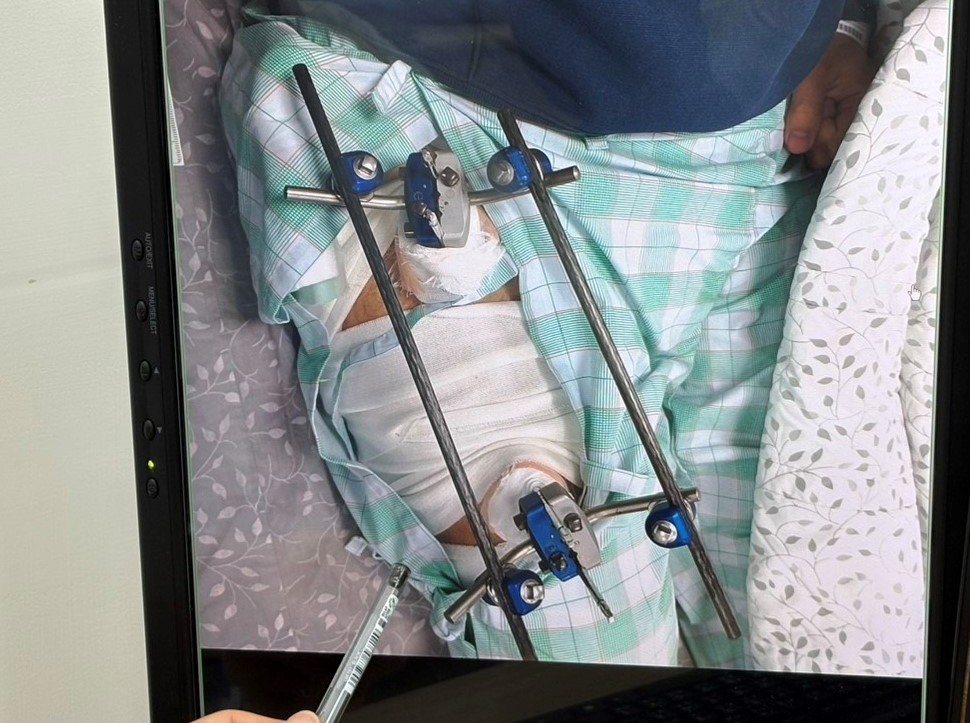李先生在日本暫時使用外固定,返台後來到光田綜合醫院,讓骨科部楊鎮源部長接手後續治療。(記者孫義方攝)